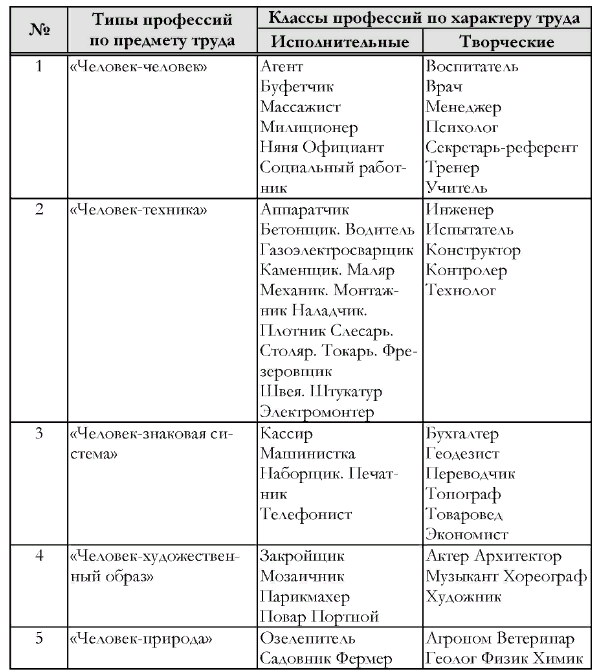 Таким образом, каждый тип профессии подразделяется на два класса. Например, в типе «Человек – Человек» есть как нетворческие профессии (массажист), так и творческие (воспитатель).