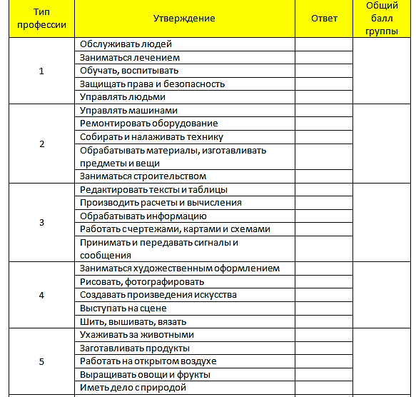 В итоге в первой и второй части нужно выбрать один тип и одни класс профессий, в которых клиент набрал большее количество баллов. Важно оценить соответствие «хочу» и «могу», найти баланс между ними и профессию, подходящую под оба параметра. Дальше выбор профессии осуществляется по классической карте профессий Е. А. Климова.